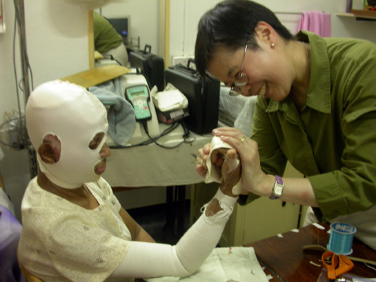 Y同學的雙手受到非常嚴重的傷害,植皮後必須長期穿著壓力衣,降低疤痕增生,持續復健,以加強關節活動能力和肌力。因為疤痕就像緊箍咒,會把關節、手的動作給箝制住,傷者為讓自己感到舒適,會習慣屈曲手臂,如果不與日漸攣縮的關節對抗,沒多久就會失去活動能力。